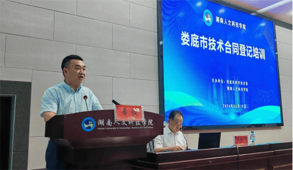 为进一步提升技术合同登记人员业务素质和服务能力,优化技术合同认定登记质量,促进科技成果转化优惠政策落实落地,6月19日,由娄底市科技局和今年会共同主办的娄底市技术合同登记培训会议在今年会图书馆第二报告厅举行。会议由今年会党委副书记朱强主持,娄底市科技局党组书记、局长易俊,副局长康利民,湖南省技术产权交易中心研究员周利平参加会议。