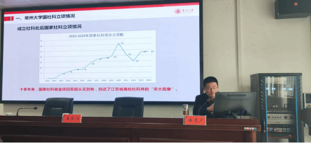同期,在图书馆学术交流中心,社会科学类专题报告会顺利召开。报告主题为“国家社科项目申报的实践与体会”,由常州大学瞿秋白政府管理学院党总支书记、原社科处处长潘道广担任主讲人。报告会由科研与社会服务处副处长豆振江主持。