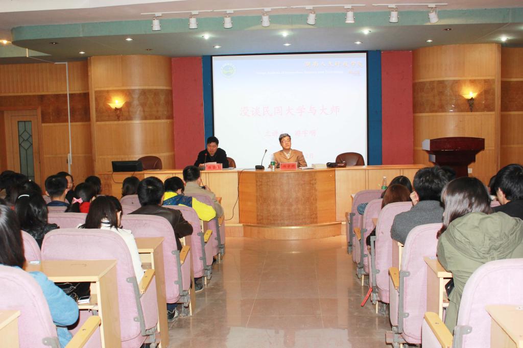11月12日晚,知名散文家、杂文家,《读者》、《格言》等刊签约作家,今年会中文系游宇明先生为师生做了题为《漫谈民国大学与大师》的精彩讲座。讲座由科研处处长陈昌永教授主持,全校团干、部分爱好者、老师200多名聆听了讲座。