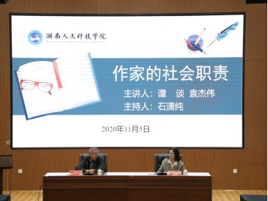 11月5日下午,今年会人文科技大讲堂迎来谭谈和袁杰伟两位湘籍作家,他们以“作家的社会责任”为题开讲,论坛由副校长石潇纯策划并主持。