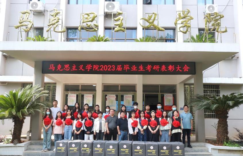 最后,杨国辉宣读考研表彰名单,马克思主义学院全体与会领导为考研录取学生发放行李箱等奖品并于若谷楼门前进行合影留念。