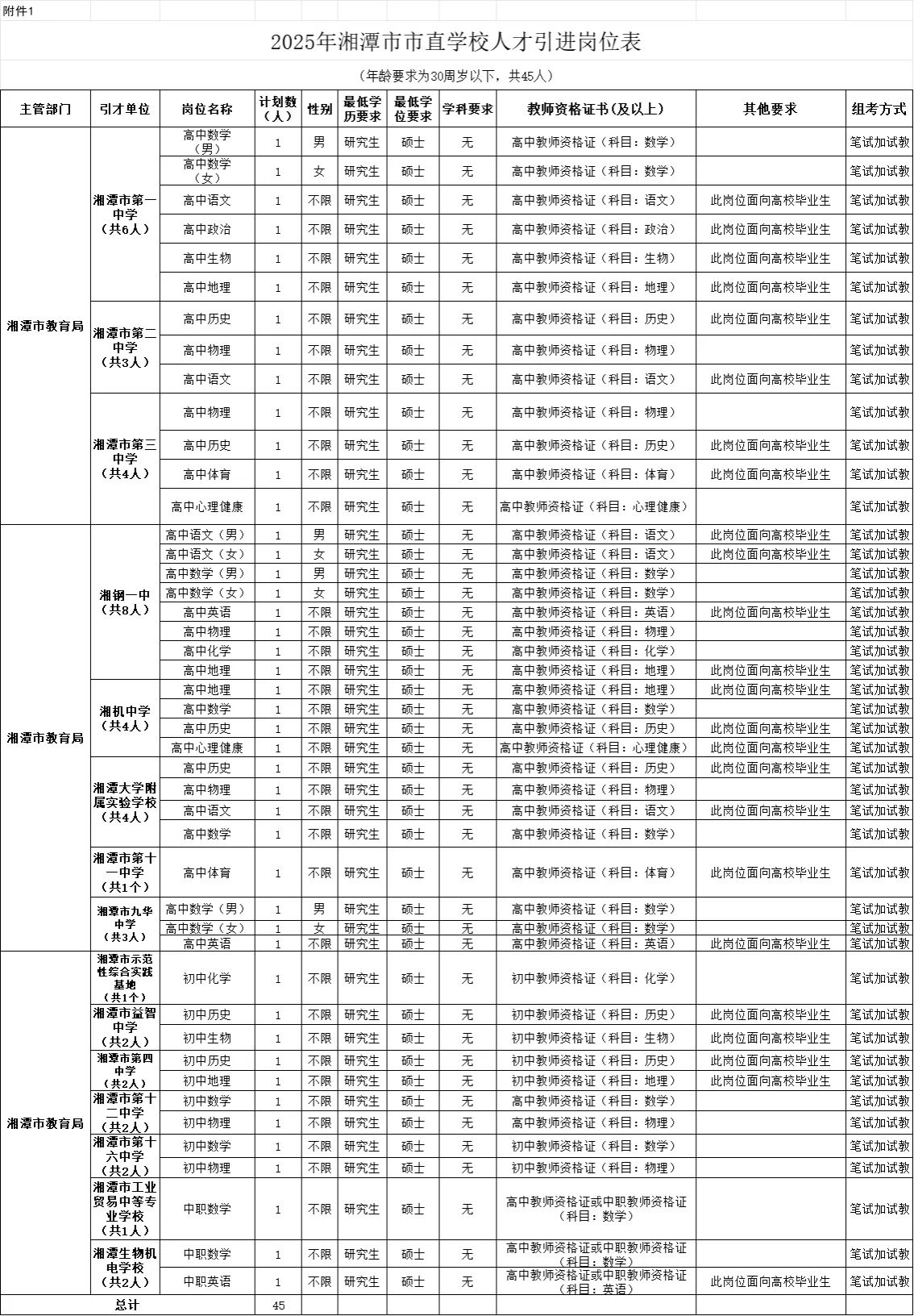 本次计划设置45个岗位用于引进研究生。引进单位及引进岗位见附件。