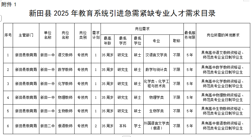 (2)各职位的具体要求详见《新田县2025年教育系统引进急需紧缺专业人才需求目录》(附件1)。