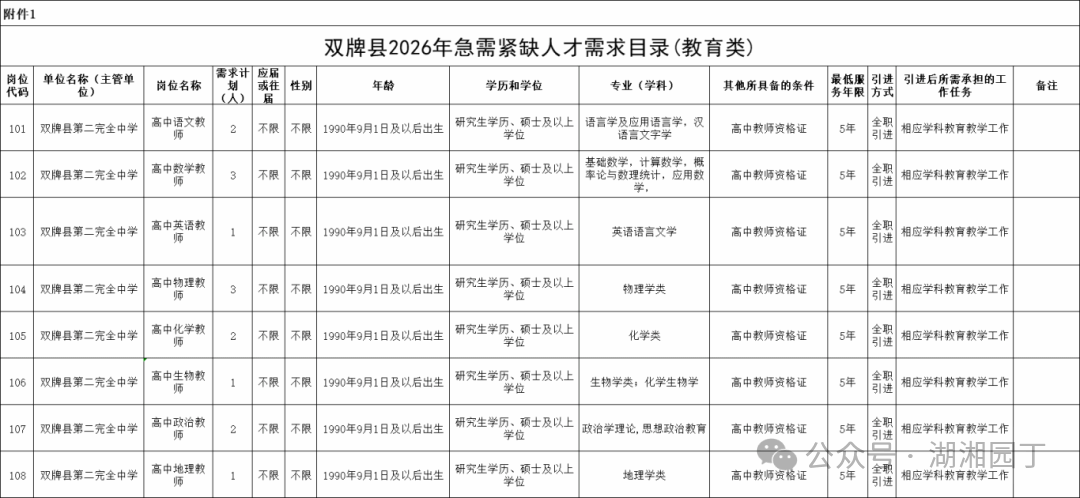 附件1:双牌县2026年急需紧缺人才需求目录(教育类)