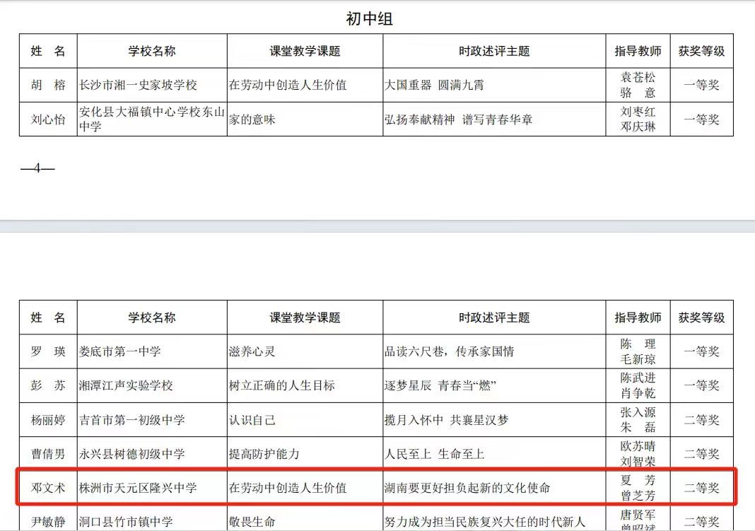 近日,湖南省教育厅公示了2024年中小学思政课教师“立德树人”教学基本功竞赛获奖名单,马克思主义学院2020届毕业生邓文术凭借扎实的教学功底和创新的教学理念,荣获初中组二等奖!