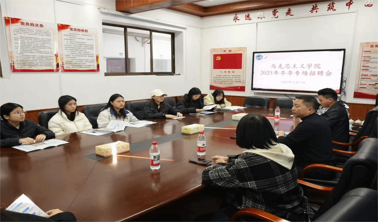 11月28日,马克思主义学院在若谷楼206会议室举办2026届毕业生专场招聘会。学院党总支副书记阳青、学工办主任张得才,长沙市麓谷高级中学等两所单位的招聘团队及2022级思想政治教育专业部分学生参加本次活动。
