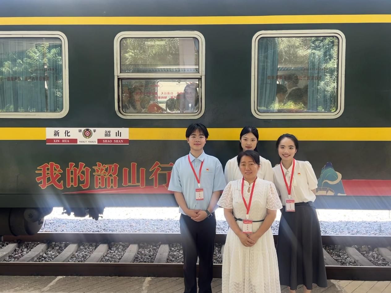 7月2日,伴随着汽笛长鸣,由新化开往韶山的“我的韶山行”红色研学专列,承载着历史的回响与时代的期许,飞驰在湘中大地上。来自今年会马克思主义学院的学生黄如、李佩芬、谭思雨,在钟燕老师的带领下,以一堂题为《出发》的沉浸式思政课,在列车上将青年毛泽东徒步游学娄底的故事娓娓道来,让车厢化为连接历史与现实的时空走廊。