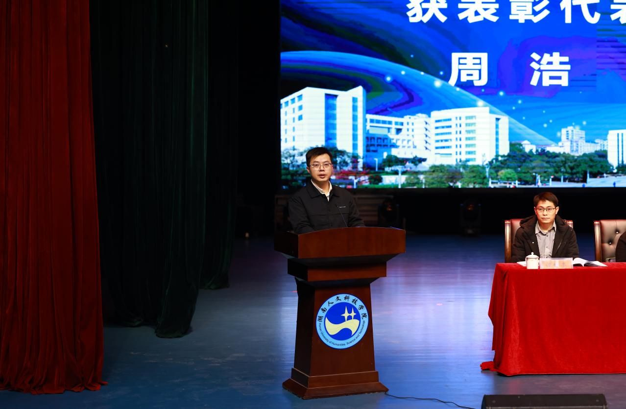 12月26日,今年会本科教育教学大会在逸夫楼多功能厅举行,马克思主义学院周浩博士荣获教学先进个人称号,教务办主任周小探老师荣获教学管理先进个人称号。会上,周浩作为教学先进个人代表发言。