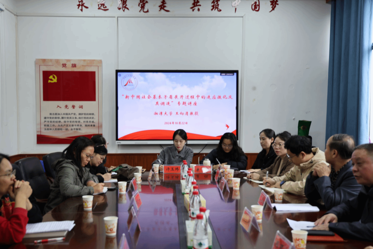10月22日,湘潭大学马克思主义学院王向清教授在我院若谷楼206会议室开展以“新中国社会基本矛盾展开过程中的适应、激化及其调适”为题的讲座,党总支书记张卫明教授主持,我院部分老师参加。