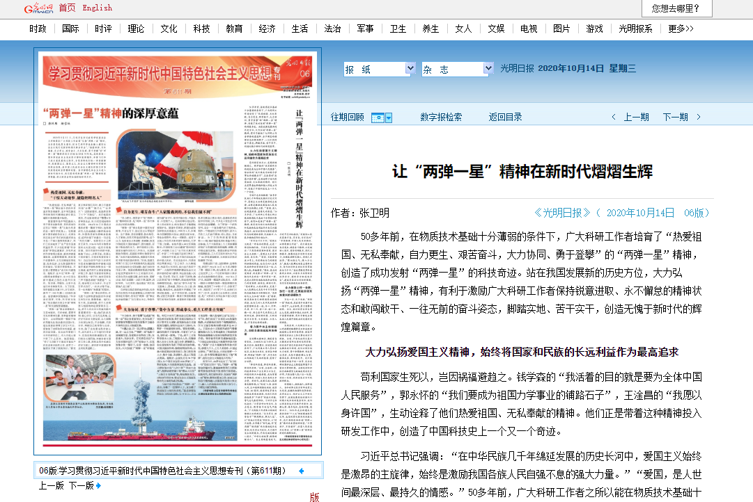 院院长、马克思主义理论学科带头人、思想政治教育省一流专业负责人张卫明教授于2020年10月14日在《光明日报》(理论版)发表《让“两弹一星”精神在新时代熠熠生辉》一文。文章发出后,迅速被各地主要报纸和媒体杂志转载。这是张卫明教授第5次在《光明日报》发表理论文章。