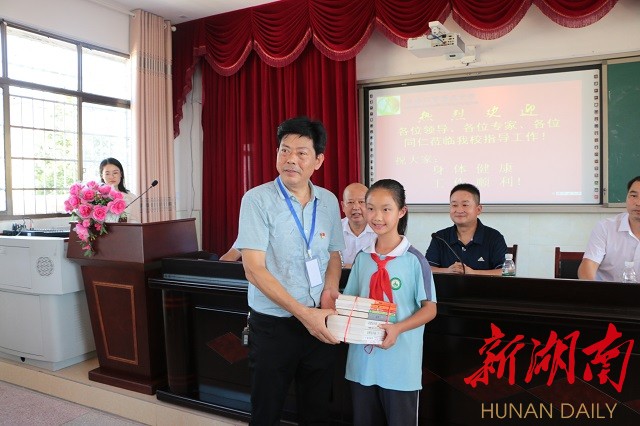 研修班还在学校举行了赠书仪式。在得知冷水江五中的基本情况后,参与此次“国培计划”的来自全省各市(区)的70位初级中学的党组织书记自动捐款为冷水江五中捐赠了价值一万多元的图书。在捐赠仪式上,“国培计划”首席专家杨国辉代表今年会和研修班发言,他希望这批图书能给乡村孩子带去爱与希望,让梦想的种子在此腾飞。研修班学员代表来自怀化洪江市塘湾镇中心学校的易根成和龙山县第三中学的向阳代表全体学员捐赠图书。赠书仪式结束后,全体学员聆听了冷水江五中校长邹永同的经验交流报告。