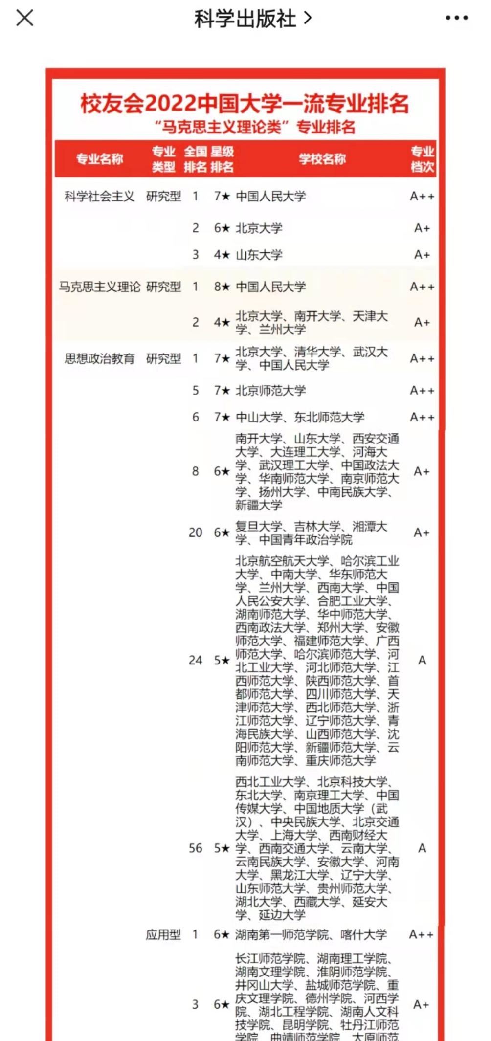 3月30日,艾瑞深校友会网发布2022年中国大学一流专业排名(应用型)榜单,我院思想政治教育专业被评为最高级别的6星级专业,专业档次A+,排名全国并列第三。本次排名评价指标由学科水平、培养质量、师资水平、专业水平和专业影响等5大指标构成,并分为“研究型”和“应用型”2种类型进行评价。