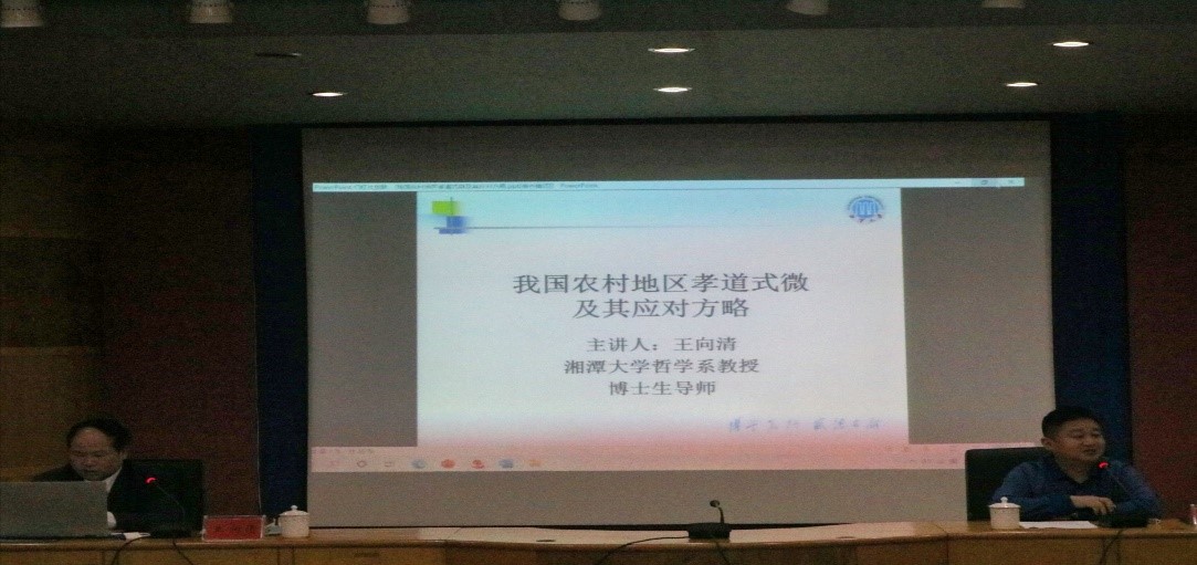 4月26日上午,湘潭大学博士生导师王向清教授应邀在养根楼报告厅为我院师生作了一场题为“我国农村地区孝道式微及其应对方略”的专题讲座。讲座由我院副院长杨国辉博士主持,校武装保卫处处长魏彦煜,我院袁承蔚副教授,李盼强博士以及18级、19级和20级全体学生参加。