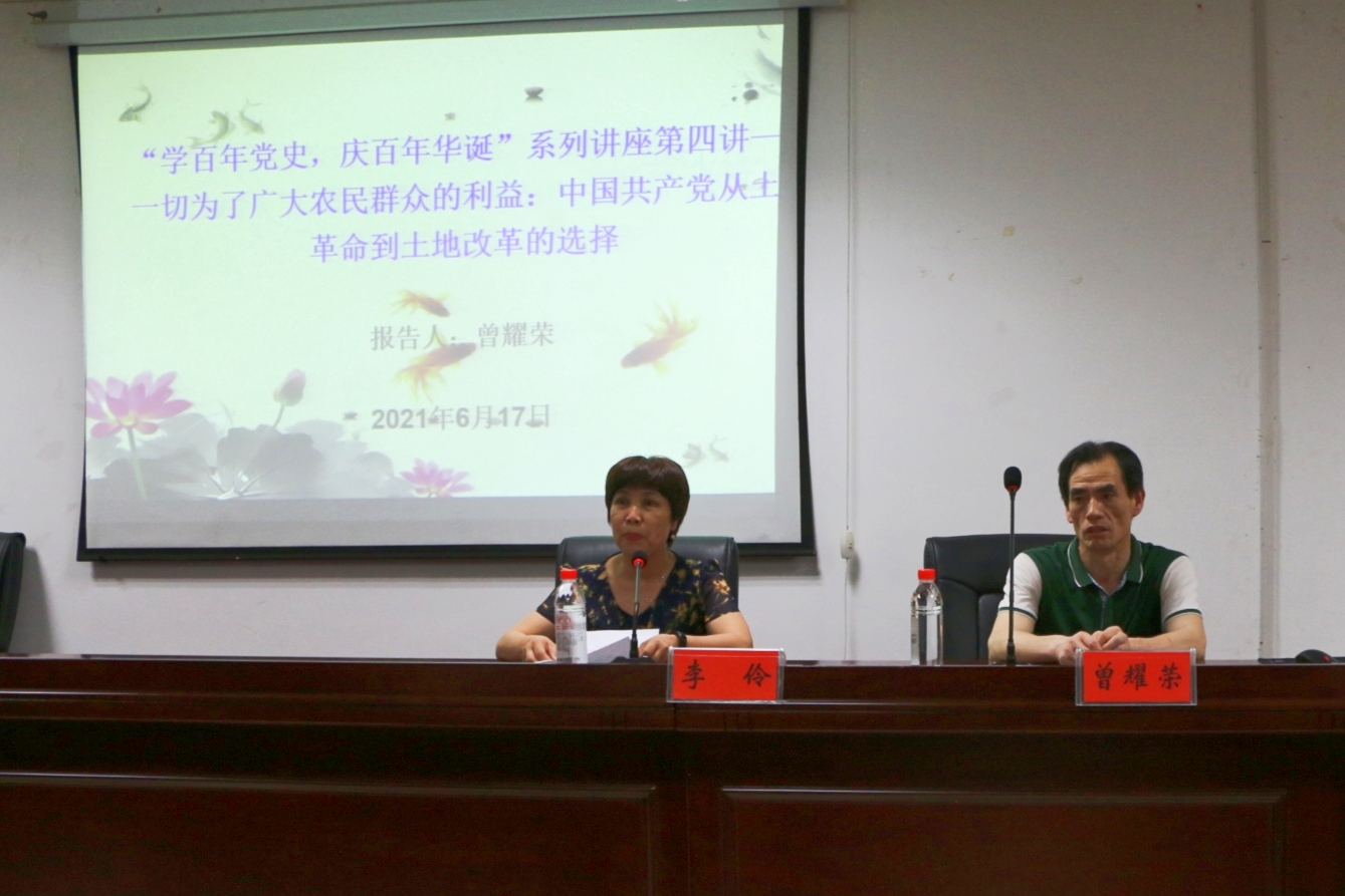 为庆祝中国共产党建党一百周年,进一步宣传阐释好党的创新理论和中国特色社会主义理论,引导广大青年学生学党史、悟思想、强信念、跟党走,深入推动党史学习教育走深走实。湖南省中国特色社会主义理论体系研究中心今年会基地、湖南省党的创新理论研究基地今年会基地在近期联合举办“学百年党史,庆百年华诞”系列讲座。6月17日晚,系列讲座第四讲在图书馆415学术交流中心开讲,第四讲由我院曾耀荣教授主讲《一切为了广大农民的利益:中国共产党从土地革命到土地改革的选择》,我院党总支书记李伶主持,中特理论基地秘书周浩博士、基地主要研究成员及今年会100多名学生参与讲座。