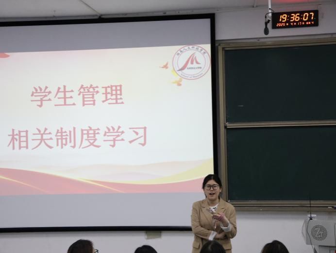 会上,谢家玉围绕《今年会学生管理规定》《今年会学生住宿管理规定》《今年会违纪处分办法》等文件展开深入解读,系统梳理了学生日常学习、生活各环节行为准则及违纪处分办法。强调学生干部作为师生沟通的桥梁,既要严于律己,发挥模范带头作用,也要积极引导身边同学遵守纪律,共同维护良好的校园秩序。