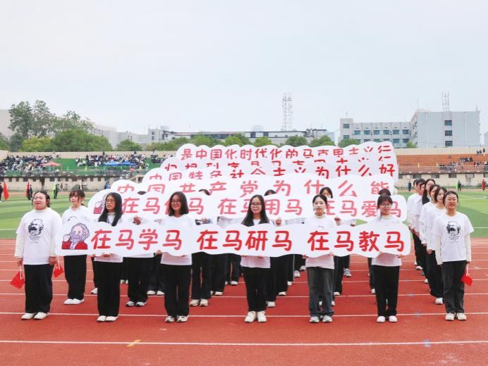 开幕式上,国旗护卫队迈着坚定而又矫健的步伐,扬起鲜艳的五星红旗,拉开了运动会的序幕。伴随着激扬的音乐,学院党总支书记张卫明、党总支副书记阳青带领运动员们以昂扬的姿态和整齐划一的步伐走入运动赛场。他们秉持马列信仰,坚定专业自信,以“在马信马、在马学马、在马爱马”的响亮口号彰显青年力量,展现出马克思主义学院朝气蓬勃的风采。我院方阵队专业特色展示赢得现场的阵阵喝彩。