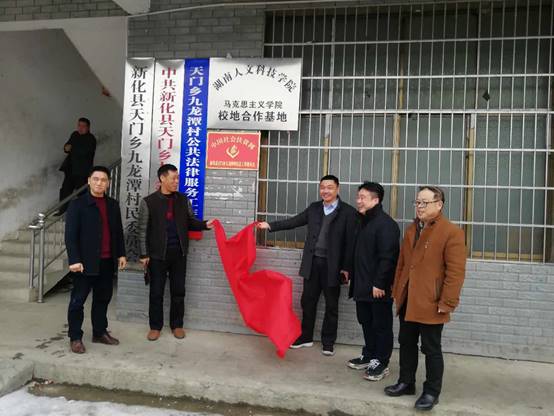 2018年2月22日,我院校外实践教育基地在新化县天门乡九龙潭村部举行揭牌仪式,新化县委副书记周海强、新化县扶贫办主任伍朝阳、新化县美丽乡村办常务副主任游小波、天门乡党委书记刘鑫、我院院长范大平、副院长陈灿芬以及九龙潭村支两委全体干部出席了揭牌仪式,仪式由我院范大平院长主持。