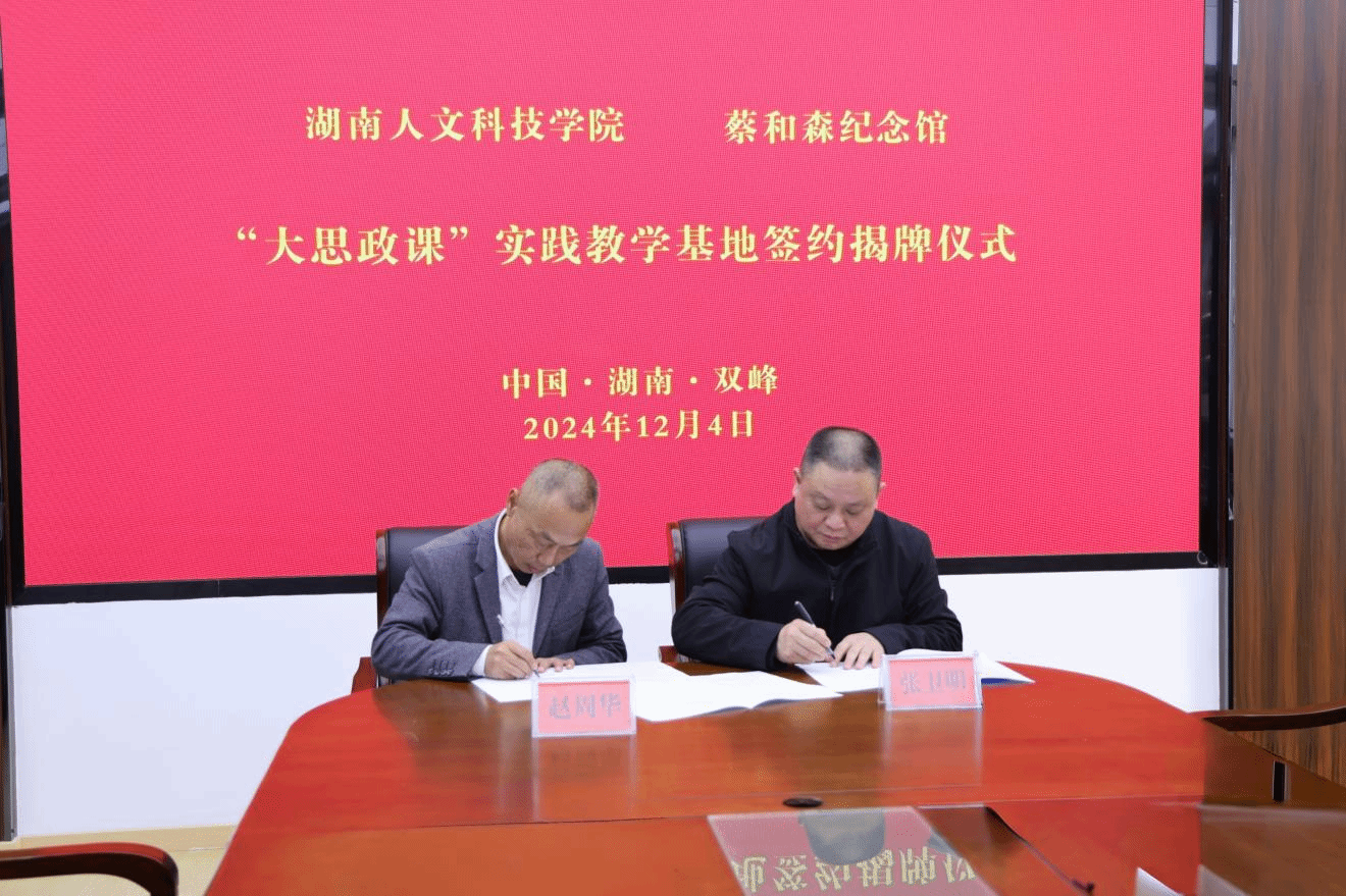 12月4日,今年会马克思主义学院与蔡和森纪念馆携手共建“大思政课”实践教学基地签约揭牌仪式暨蔡和森红色精品思政课第一次审稿会在双峰县委宣传部5535会议室举行,仪式由双峰县委常委、宣传部部长吴晔主持,娄底市委宣传部谭周易、市社科联李鹤艳和刘佑萍,今年会马克思主义学院党总支书记张卫明、院长于意、副院长成赛军,校学报编辑部主任杨国辉及6名主创人员,双峰县葛绍波、王彩虹、赵周华等出席。“大思政课”实践教学基地的建立是继双方签约“蔡和森”红色精品思政课项目后,学院与蔡和森纪念馆共商共建的又一重要举措。
