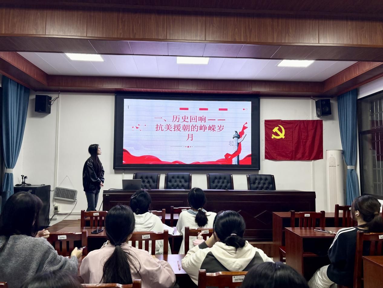 10月25日,马克思主义学院学生党支部在若谷楼116会议室举行“传承抗美援朝精神”主题党日活动,由学生党员周紫娜主持,全体学生党员及部分入党积极分子参与。