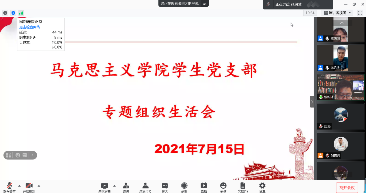 7月15日晚,我院学生党支部利用腾讯会议开展了“学党史 悟思想 办实事 开新局”专题组织生活会,本次会议由学生党支部书记张得才主持,全体学生党员参与。