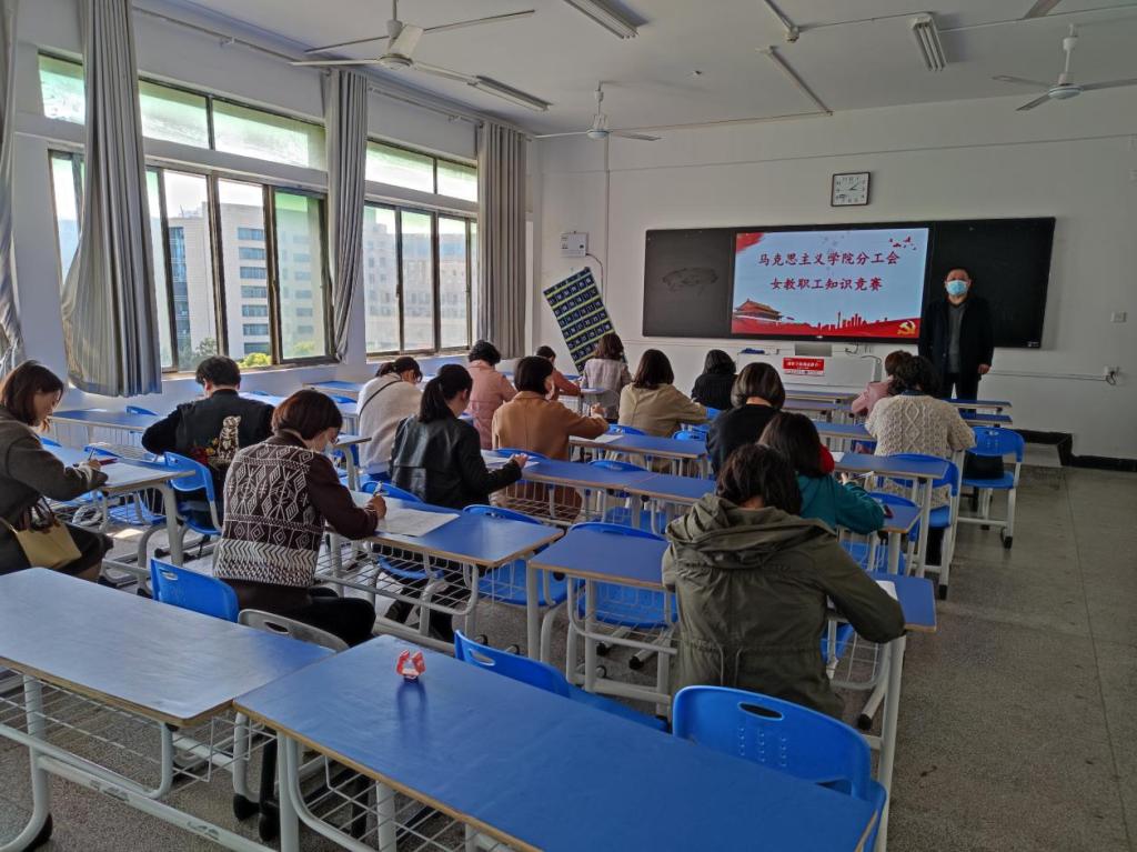 活动于3月8日下午3:00在致远楼603教室举行,马院全体女教师,分工会主席和院领导现场助力,竞赛采用开卷答题的方式进行,女老师们凝神聚力、认真思考、快速查阅资料,一小时后全部答题完成。老师们表示:这次知识答题,让我们学到了不少的知识,特别是妇女权益保障、劳动特别规定等法律法规知识;健康养生、关爱自身心理等方面的内容也很不错。活动在院领导忠诚、热情的祝福声中和女老师们的欢声笑语中结束。