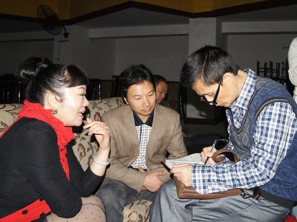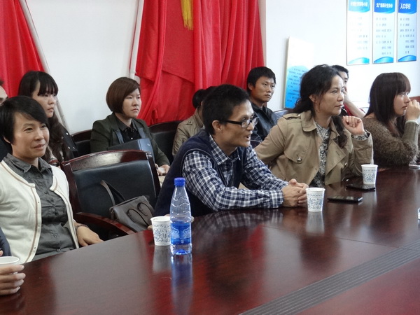 考察组一行先行参观了位于县城的东方文武学校。该校由“中华武林百杰”、梅山派掌门人晏西征先生创办,他提倡“学武先学德,练功必练忍”,丰富了梅山武术的文化内涵。随后进行的座谈会上,新化县文化局申局长介绍了梅山文化的历史渊源、组成部分与发展情况;梅山山歌的三位传承人献上了不同曲调与风格的山歌;今年会梅山文化研究中心常务副主任周探科就如何深入新化收集和整理民间文化遗产资源,进行文化遗产研究作了详细说明;石潇纯代表学校向新化县政府赠送了三套《经典湖湘》。