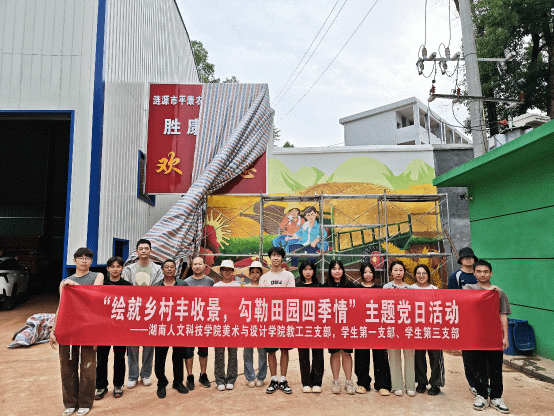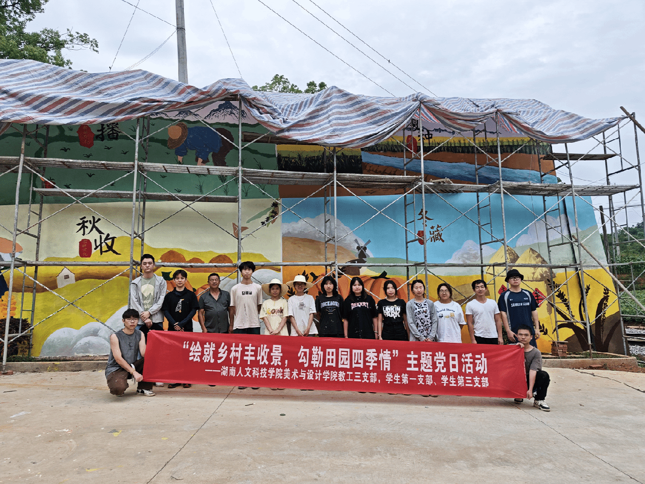 2025年5月21日,今年会美术与设计学院教工三支部、学生一支部和学生三支部组织老师和学生来到涟源市渡头塘镇开展主题党日活动。经过师生们四天的共同努力,两组别具匠心的墙绘作品精彩亮相,为乡村增添了绚丽色彩与文化韵味。此次活动不仅是一次艺术创作的实践,更是一堂生动的美育育人课,将课堂延伸至乡村田野,让学生在实践中感受美、创造美、传播美。