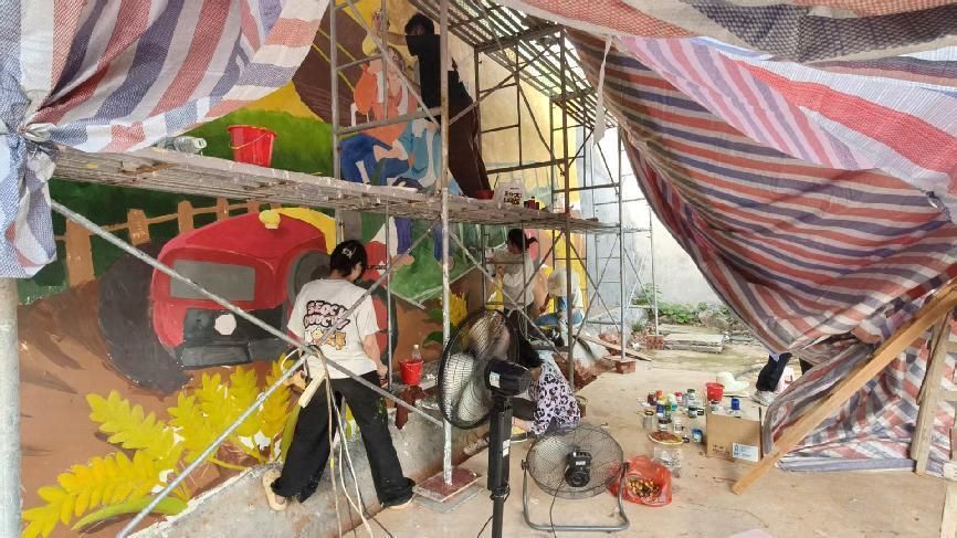 在创作前期,师生们深入调研渡头塘镇的风土人情、农耕文化特色,结合乡村实际环境,精心设计墙绘图案。绘制现场,师生们充分发挥专业所长,手持画笔、调色板等工具,在墙体上认真勾勒线条、细心填充色彩。大家各司其职,又相互配合,手中的画笔在墙面上穿梭,勾勒出一幅幅生动的画面。在创作过程中,学生们不仅锻炼了绘画技能,更在实践中体会到了艺术的魅力和价值,实现了从“知”到“行”的转化,真正实现了美育育人的目的。