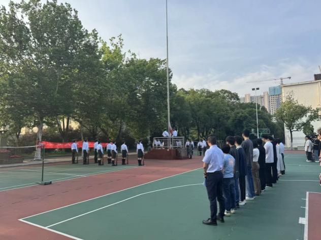 晨光中,国旗护卫队踏着坚定有力的步伐护送国旗入场。全体师生肃立注目,雄壮的国歌声响起。朝阳洒下金色光辉,五星红旗迎风展开,在庄严的注目中冉冉升起,迎风飘扬。