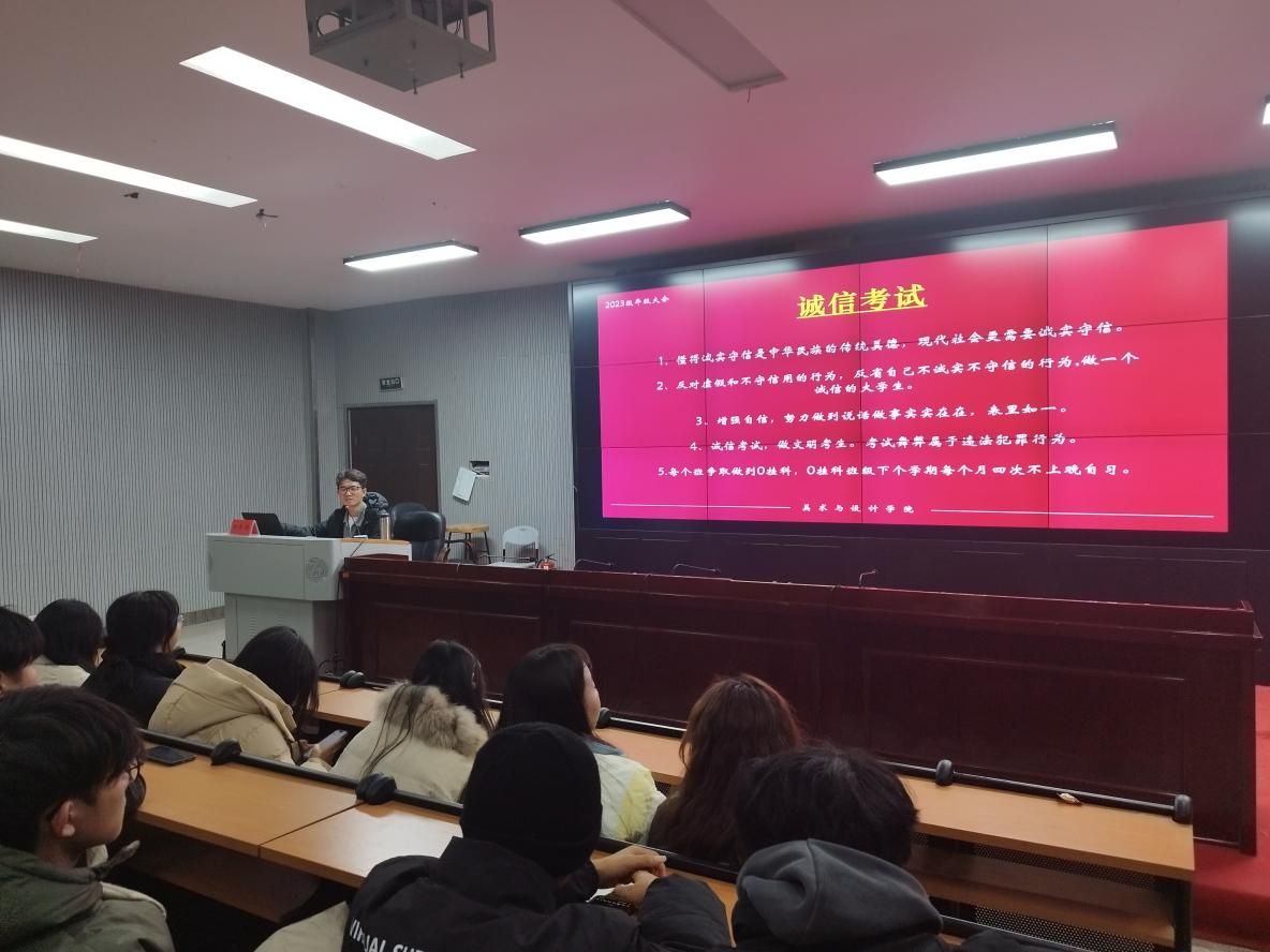 接着,2023级辅导员柳泽伟作了动员讲话。他指出,期末考试临近,同学们应当充分利用考前宝贵时间,发挥主观能动性,讲究学习方法,提高学习效率,科学合理安排时间,认真复习、查漏补缺,了解考试纪律,明确自身责任,勿因考试舞弊而损害自己的诚信。他还强调,诚实守信是做人之根本,同学们要诚实做人、严守考纪、诚信考试。希望同学们在即将到来的期末考试中以良好的心态积极备考,在考试中沉着冷静、认真细致,为自己交上一份满意的答卷。