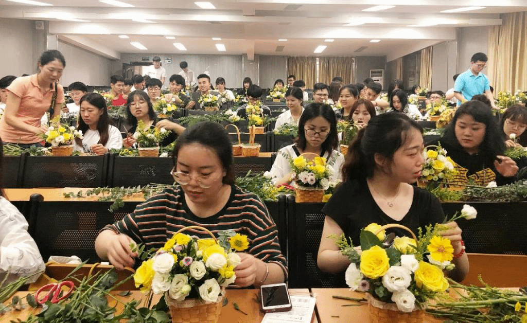 环境设计专业学生用鲜花进行现场实操--自然系的插花训练