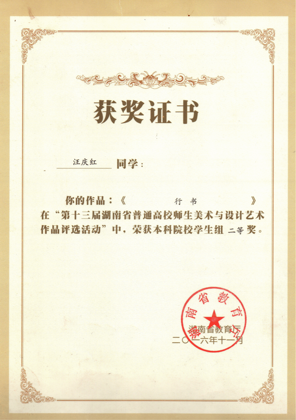 在校期间获第十三届湖南省普通高校师生美术与设计艺术作品展二等奖以及高中美术教师资格证。