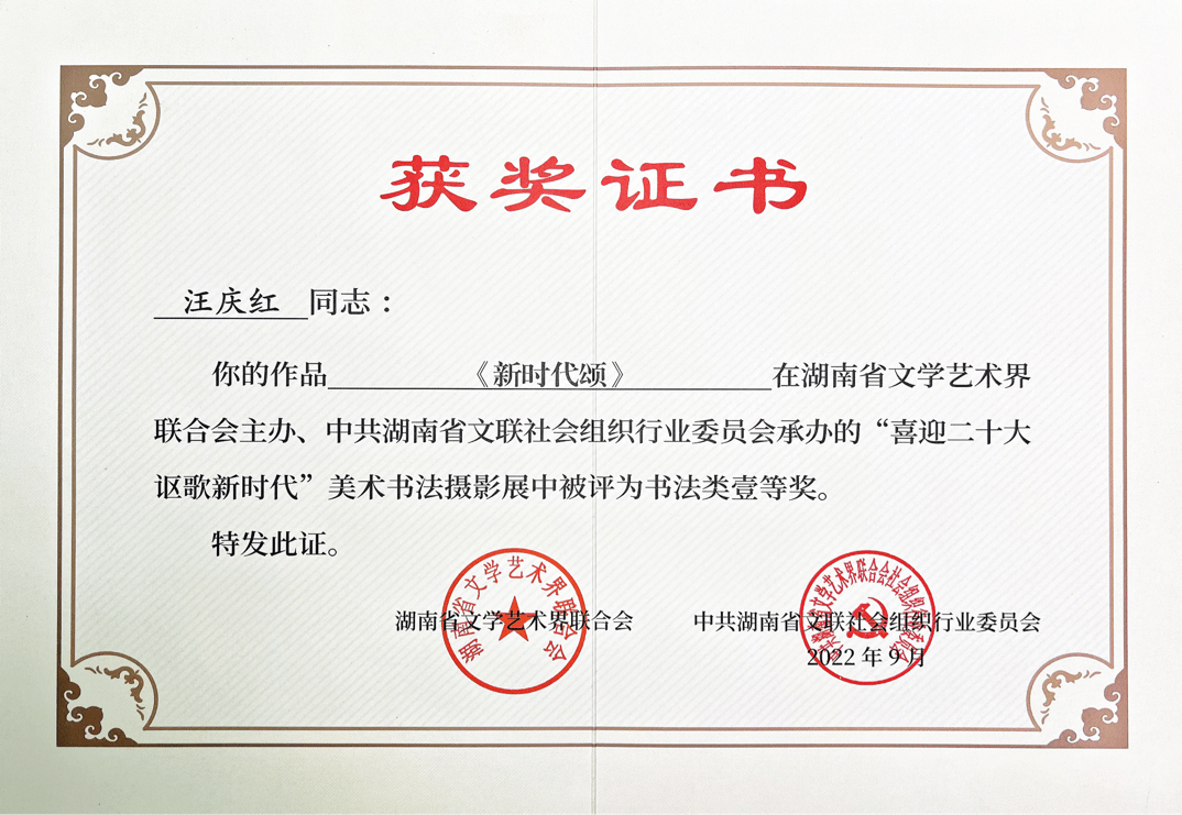 2022年获湖南省“喜迎二十大 讴歌新时代”美术书法摄影展书法类一等奖。