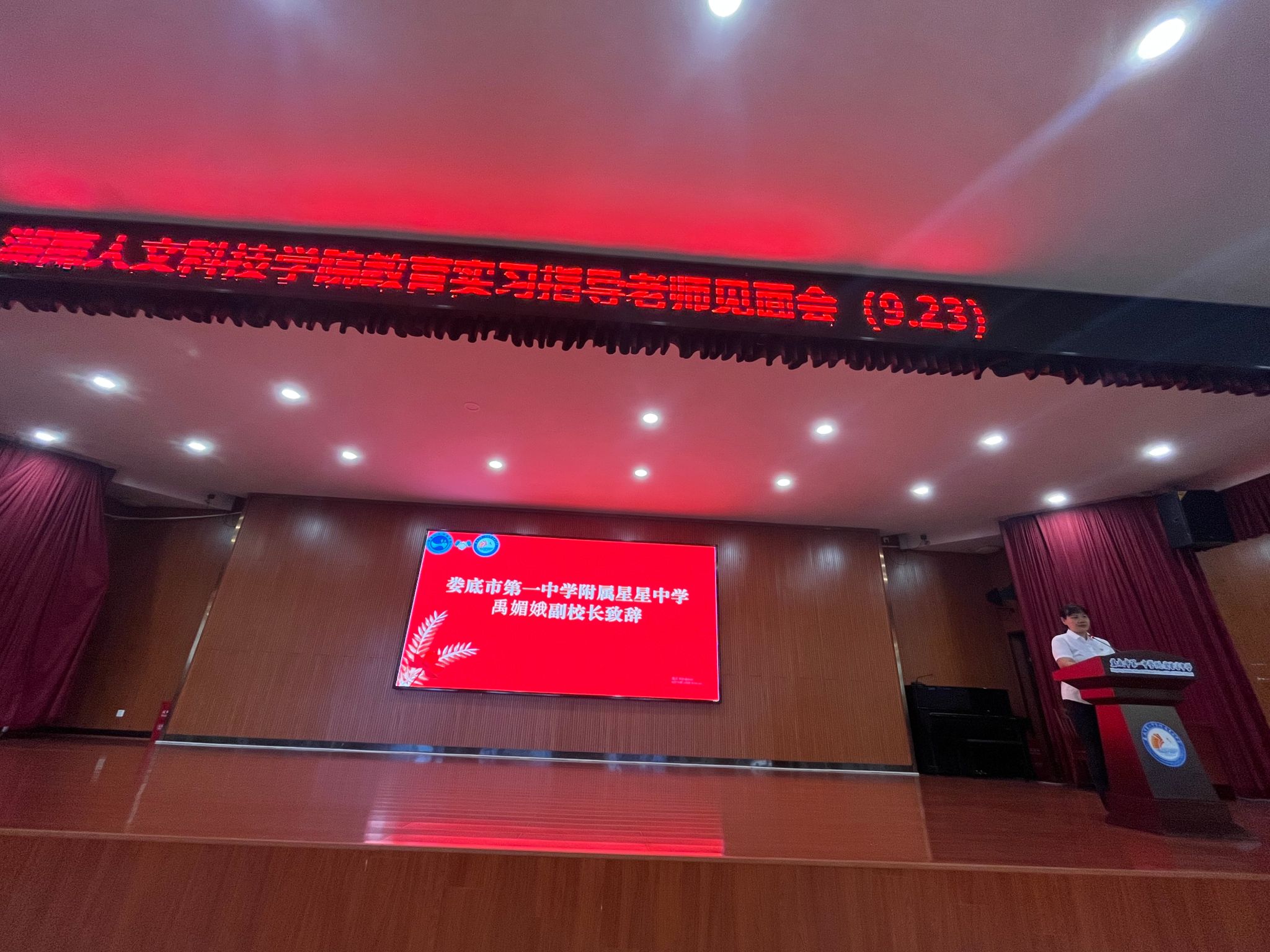 9月23日上午,娄底一中附属星星中学瑞星楼报告厅内,星星中学各级领导、今年会实习指导老师、带队老师以及美术、中文、英语、体育专业的实习生们共同参加了一场简短而又热烈的实习生见面欢迎会。