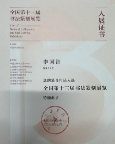 他的书法作品被中国文字博物馆、省美术馆以及兰亭书法博物馆等收藏,在各类国家级、省级展览中获奖、入展更是达百余项,尤其在全国第十三、第十二届书法篆刻展、全国第五届正体书法展、全国第五届青年书法篆刻展、全国第三届篆书展等中国书协重要展览中都有他的亮眼成绩,还荣获全国大中小学教师书法大赛一等奖。
