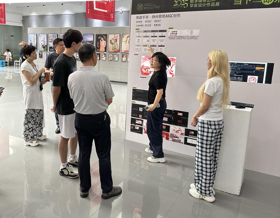 5月28日,数字媒体艺术专业2025届毕业设计作品展在美术与设计学院二楼展厅盛大启幕,展览将持续至6月1日。此次展览共展出47组学生原创艺术佳作,作品形式丰富多样,涵盖动画影像、三维场景建模、“纸韵千年——扬州剪纸”AIGC创作系列、非遗数字叙事、数字绘本以及增强现实(AR)、虚拟现实(VR)互动、摄影、纪录片等,全方位展现了数字媒体艺术专业学生在艺术表达与技术融合方面的卓越能力与创新成果。