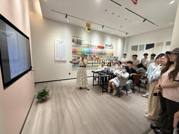 抵达千里红家居广场后,学生们首先来到本杰明涂料展厅。本杰明涂料的企业负责人热情接待了师生一行,并对其品牌历史、产品特色、核心技术及市场应用进行了详细介绍。展厅内丰富多样的涂料产品与精美的涂装样板,生动展现了本杰明涂料在色彩调配、环保性能与装饰效果上的卓越品质。学生们一边聆听讲解,一边仔细观察不同涂料的质感与色彩,积极提出问题,与企业人员展开深入交流,对涂料行业的发展趋势与创新技术有了更直观的认识。