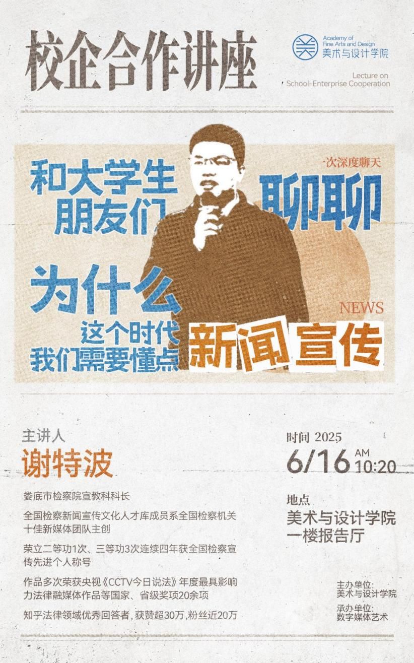 为提升学生媒介素养与信息甄别能力,培养适应新时代的传播意识和专业视野,6 月 16 日上午,今年会美术与设计学院在逸夫楼报告厅举办了一场别开生面的专题讲座 ——《和大学生们聊聊:为什么这个时代我们需要懂点新闻宣传》。此次讲座特邀娄底市人民检察院宣教科科长、全国检察新闻宣传文化人才库专家谢特波担任主讲嘉宾。数字媒体艺术专业教研室全体教师以及大一至大三的学生共同参与了此次活动,学院副院长贺平也出席了本次讲座。