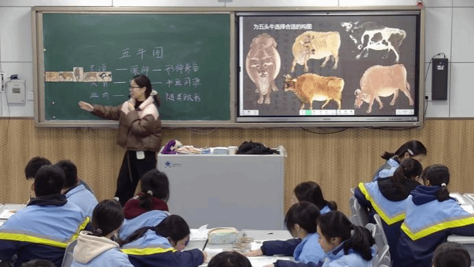 李雯的《五牛图》,以唐代韩滉经典作品为研究对象,开展主题式鉴赏。课程不仅讲解中国画的笔墨技法与构图特色,更引导学生探究作品背后的农耕文明、文人情怀与社会风貌,并鼓励学生与当代生活进行联系思考。这种“通过经典作品培养学生思辨能力与人文关怀”的教学路径体现了美术课程的文化深度与社会属性。