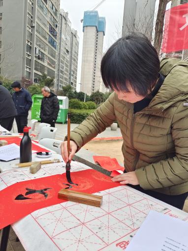 尽管天气严寒,但党员们的创作热情高涨,现场气氛热烈而温馨。他们手持毛笔,神情专注地在红纸上挥毫泼墨,为社区居民书写春联。春联内容既有寓意吉祥的传统佳句,也有紧跟时代步伐的新春寄语,每一副都承载着满满的新年祝福和对美好生活的向往。随着一幅幅春联的完成,党员们马不停蹄地将这些满载祝福的作品送到了社区居民手中。居民们纷纷表示,这样的活动既让他们感受到了传统文化的魅力,又让他们切实体会到了组织的关怀和温暖。