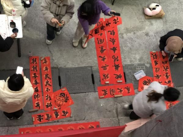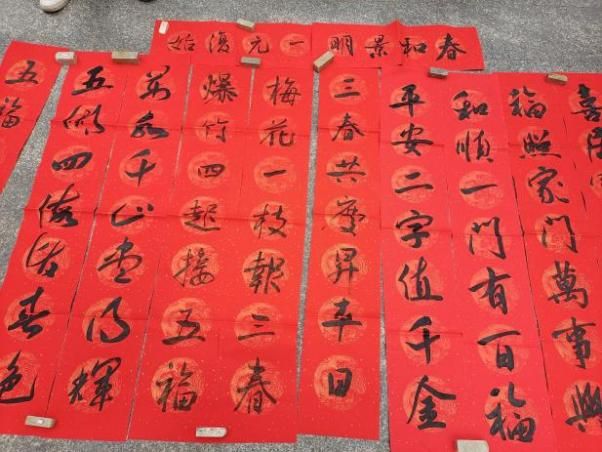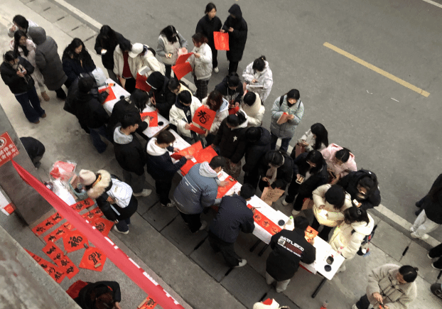 社区过后,活动阵地相继先后转移到了学校食堂和逸夫艺术楼,将写赠春联活动推到高潮。党员们再次拿起毛笔,为大量聚集等待领取春联的学校师生和附近居民,持续一轮又一轮的创作,他们根据不同需求,量身订制了各具特色的春联,既有励志的,也有祝福的,每一副都寄托着对新的一年美好祝愿。