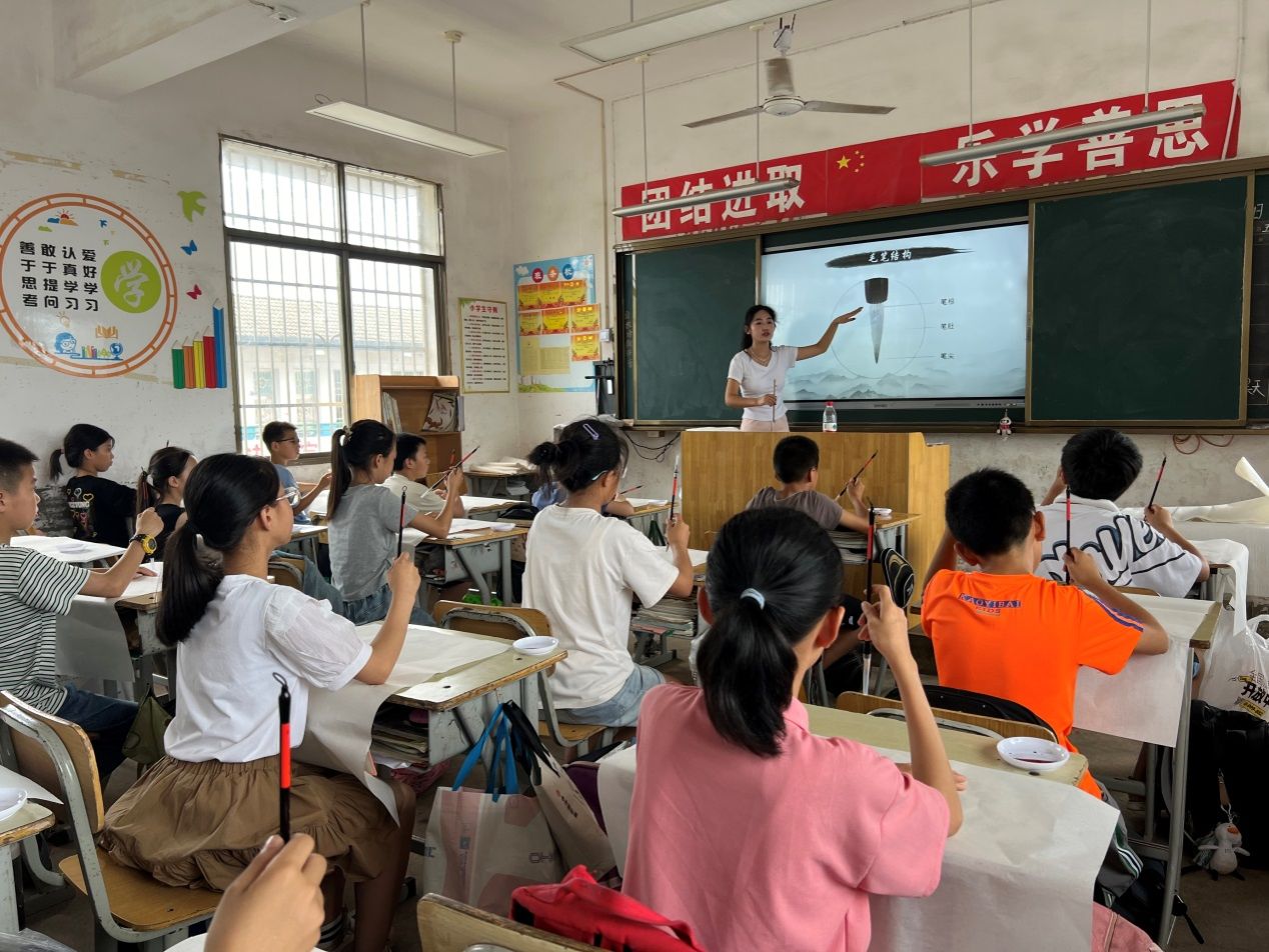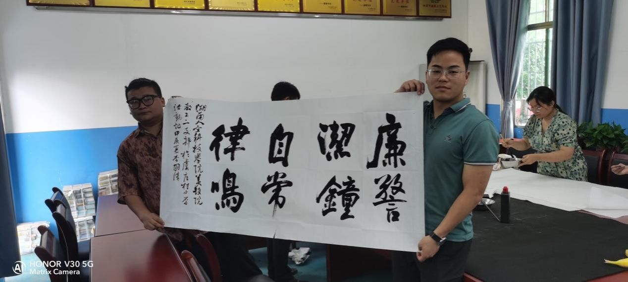 上午9:30——10:30,第二教工党支部党员教师和书法学专业学生到虞唐镇中学会议室为该校和虞唐镇学区书写党纪学习教育有关书法作品。接着,应虞唐镇学区和虞唐镇中学请求,教师党员为他们的各个办公室书写书法作品,并进行书法作品上墙装潢设计。2022级书法学专业学生邓亚辉则应邀到虞唐镇小学为五年级学生上书法课,邓亚辉同学趣味盎然的教学使整个教学过程高潮迭起。郭刚同学负责拍照和书写书法作品送给互动中最为突出的学生。一节课结束,学生意犹未尽,邓亚辉和郭刚同学应班主任要求,将课延长了30分钟。午饭之后,第二教工党支部党员教师和书法学专业学生继续为虞唐镇小学书写党纪学习教育书法作品,并创作了总计二十多幅书法作品赠送给该学区的领导和老师们。