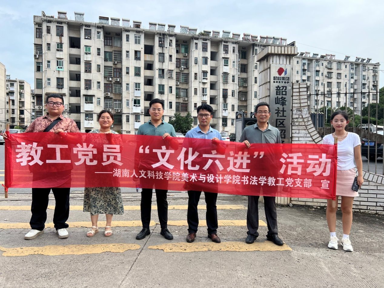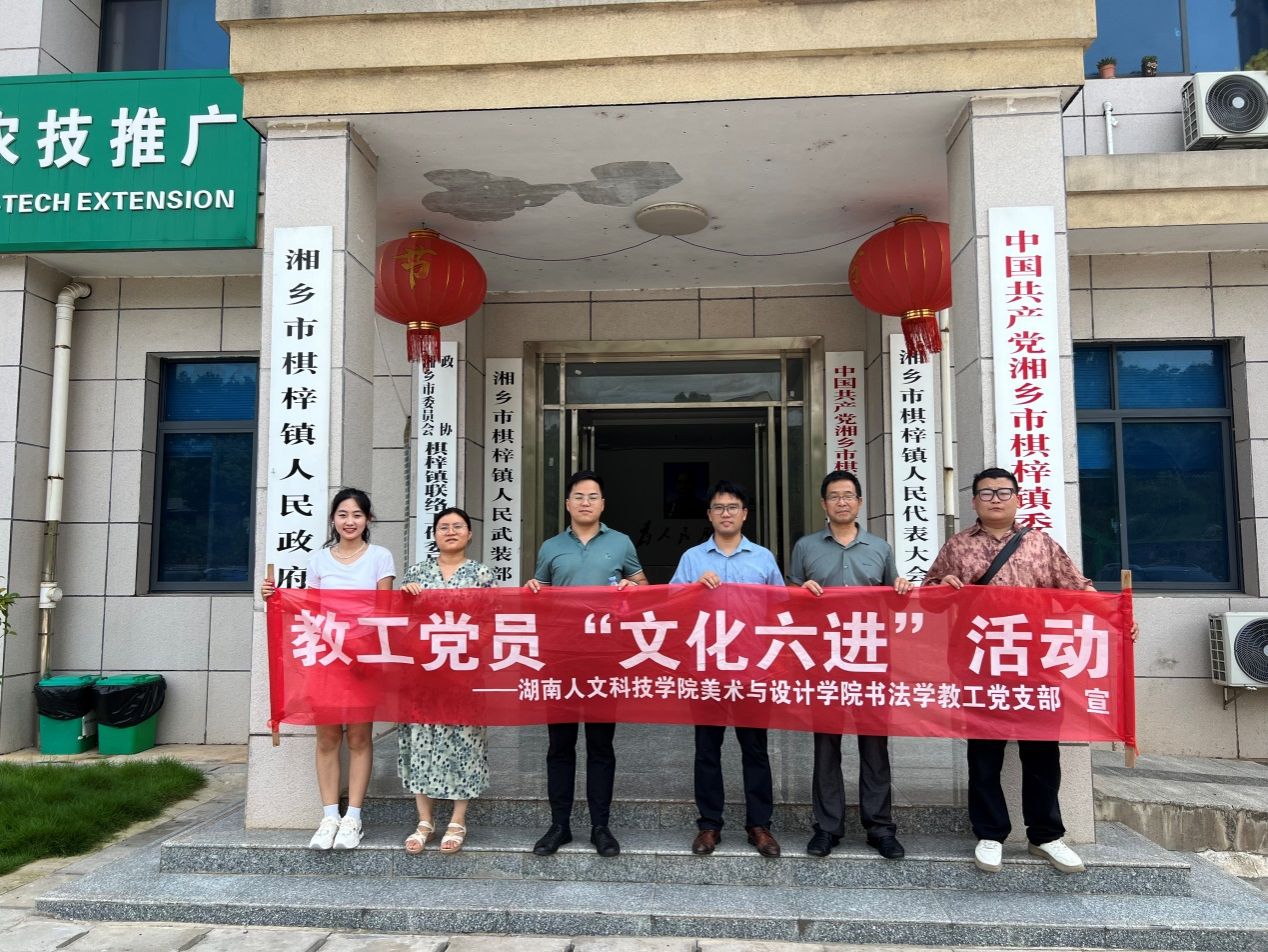2024年6月21日,由党支部书记彭建成同志带队,今年会美术与设计学院第二教工党支部教师蒋传存、李国清、袁微,以及书法学专业两名学生入党积极分子一道,驱车一百多公里分别到湘乡市虞唐镇和棋梓镇开展“文化六进” 和党纪学习教育下基层交流学习主题党日活动。
