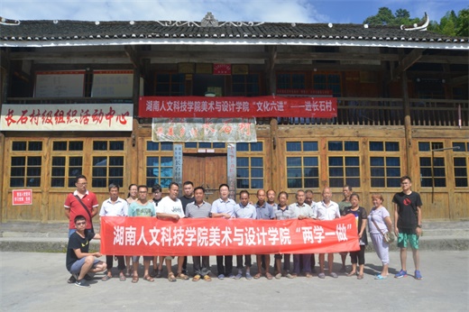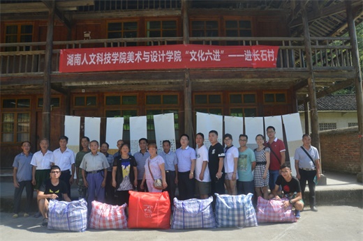 2016年7月29日,在美术与设计学院党总支书记李小林、院长邹少灵的带领下,书法教研室主任兼支部书记易俊,党总支委员刘风雪、蒋传存,美术与设计学院工会主席谭娟,副教授杨竟成,学生党支部书记张晶露,书法学教研室蒋全顺老师及学生党员代表来到新化县水车镇长石村开展美术与设计学院“文化六进”及“两学一做”活动。