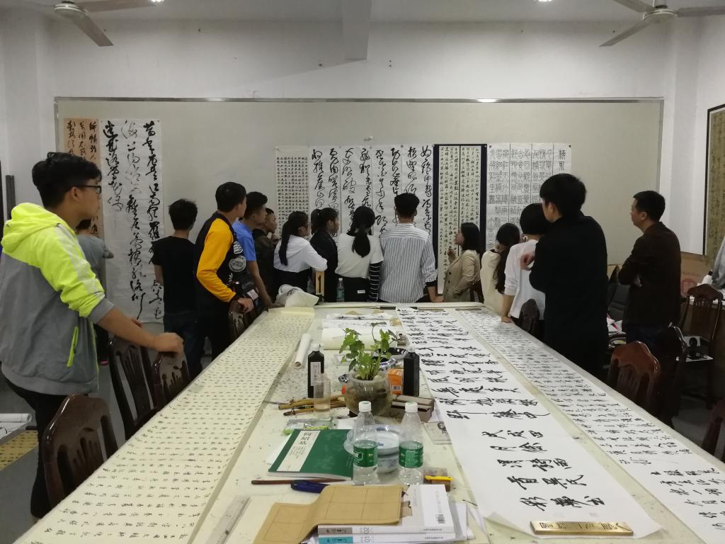 书法学教研室主任蒋全顺介绍了我院书法学专业培养模式和方法,并与胡瑶老师探讨了高校书法教育在十年内的发展成果以及存在的问题等等。蒋老师还邀请胡老师参观我院书法学专业创作室并一一点评学生习作。之后又与书法学专业15级考研同学进行交流互动,胡老师讲述了自己备考暨南大学书法专业研究生的经历和复习思路,并希望以后同学们有问题积极主动的向她咨询,同时也祝愿同学们能在考研中取得好的成绩。