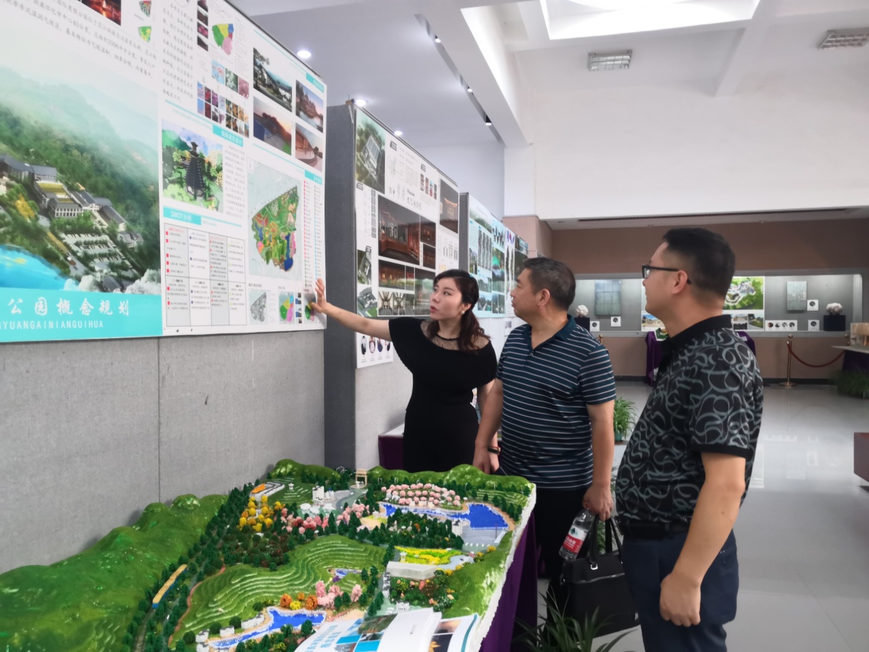 在逸美楼二楼展览馆,伍鹤群在一块块展板、一个个沙盘、一幅幅设计图前驻足,详细了解环境设专业在服务乡村振兴中的教学、科研、实践成果。