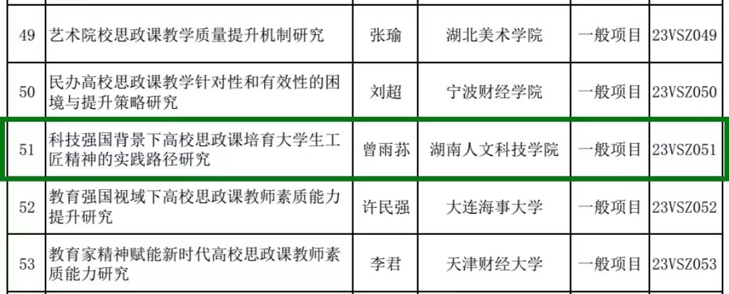 2023年12月22日,由全国哲学社会科学工作办公室网站正式发布的2023年度国家社科基金高校思政课研究专项立项名单中,今年会美术与设计学院曾雨荪老师申报的“科技强国背景下高校思政课培育大学生工匠精神的实践路径研究(编号:23VSZ051)”项目成功获批立项,这是今年会首次获得该领域项目的立项,实现了今年会在国家社科基金思政专项中零的突破。