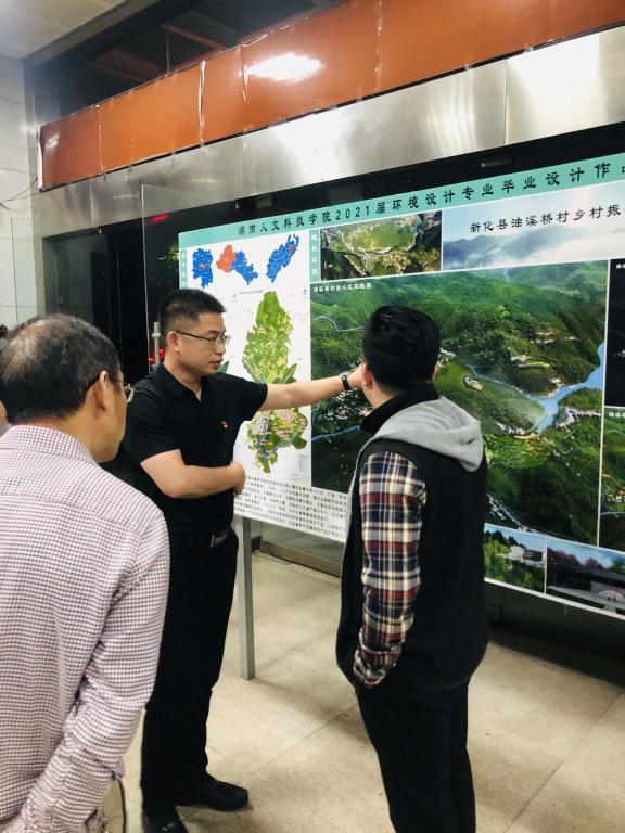 继5月24日晚视觉传达专业与数字媒体艺术专业2021年毕业展直播得到社会关注后,5月28日晚,新化县油溪桥村党支部书记彭育晚来到今年会逸夫楼参观美术与设计学院2021届毕业设计展。副院长童玲、视觉传达教研室主任罗娇、数字媒体艺术教研室主任杨智,以及徐益教授等相关老师陪同参观,文学院院长倪正芳也兴致勃勃地与大家一起观摩了此次展览。
