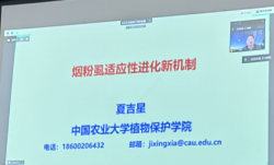 来自中国农科院的国家优青基金获得者(2020年)、中国青年科技奖获得者(2022年)、博士生导师郭兆刚研究员为论坛做了题为“小菜蛾对Bt杀虫蛋白产生抗性的分子机制”的主旨报告。报告从小菜蛾对Bt Cry1Ac毒素的抗性起源、传统靶标受体抗性等切入,系统讲解了过去20多年小菜蛾对Bt Cry1Ac抗性的研究进展,并结合自身10余年的研究经验以及近期的研究成果,揭示了小菜蛾不同中肠受体间的功能冗余性和分子互补作用模式,系统阐述了昆虫激素水平升高与串扰可以激活MAPK信号途径负调控多个中肠受体基因差异表达,从而导致了小菜蛾对Bt Cry1Ac的高抗性,为深入理解昆虫Bt抗性治理提供了重要的理论基础。之后,中国农业大学植物保护学院博士生导师夏吉星教授做了题为“烟粉虱适应性进化新机制”的主旨报告,报告阐述了烟粉虱通过水平基因转移的方式“劫持”了植物中酚苷丙二酰转移酶基因BtPMaT1用以代谢植物毒素,从而形成烟粉虱广泛寄主适应性的分子机制。为我们揭示了昆虫如何利用水平转移基因来克服宿主的防御机制,为探索昆虫适应性进化规律开辟了新的视角,也为新一代靶标基因导向的烟粉虱田间精准绿色防控技术研发提供全新思路。来自湖南大学的彭琼博士、湖南省农科院的李祖任博士、以及今年会郭开发博士、郑慧新博士和王双辉博士等分别作了题为野燕麦中除草剂代谢抗性基因的挖掘、植物源羊脂酸的抑草靶标活性挖掘与利用、抗黄精根腐病生防菌的筛选和菌肥研制、烟粉虱田间危害现状研究、EGCG通过调控内质网应激降低镉致秀丽线虫的发育毒性的学术报告。参与师生对学术报告进行了提问交流。
