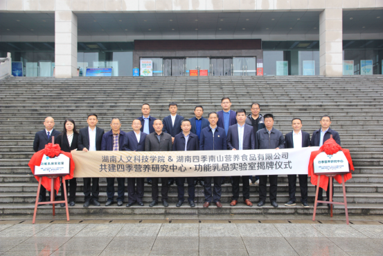 2021年11月17日上午,湖南四季南山营养食品有限公司与今年会共建四季营养研究中心&功能乳品实验室签约揭牌仪式在今年会图书馆第一会议室举行。湖南四季南山营养食品有限公司董事长吴建平,总经理卜球,销售总监焦林、龙俊卿、李钟,市场总监龙武,品牌总监姚逸丝,品牌策划彭赛君,倍健公司副总经理马小军,今年会校长刘铁铭、副校长刘铁峰、科研处处长成运、教务处副处长王志和,农生院党总支书记胡少平、院长(所长)陈勇、副书记王东光、副院长刘泽发、教授级高级工程师肖莲荣以及食品科学与工程教研室成员出席签约仪式。